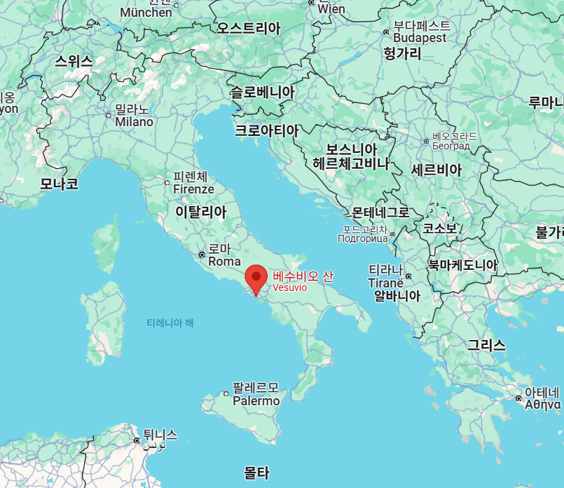 베수비오 화산은 이탈리아 나폴리(Napoli) 도심에서 약 9km 동쪽에 위치해 있으며, 나폴리는 이탈리아 제3의 도시이자 남부 최대 항구도시입니다.